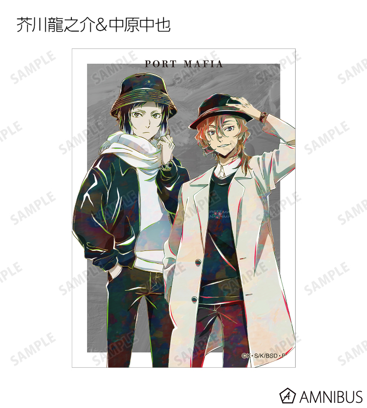 中島敦、太宰治、芥川龍之介、中原中也の描き下ろしイラスト、組織名、キャラ名を新たなタッチで魅力的に表現し、ブロマイドに仕上げました。