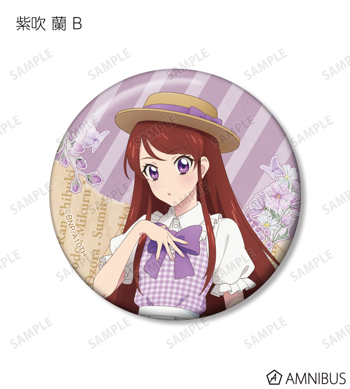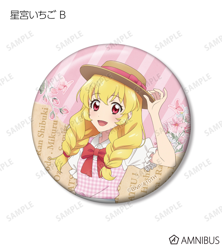 星宮いちご、霧矢あおい、紫吹 蘭、藤堂ユリカ、大空あかり、氷上スミレ、夏樹みくるの描き下ろしイラストを、コラージュ風デザインの缶バッジに仕上げました。