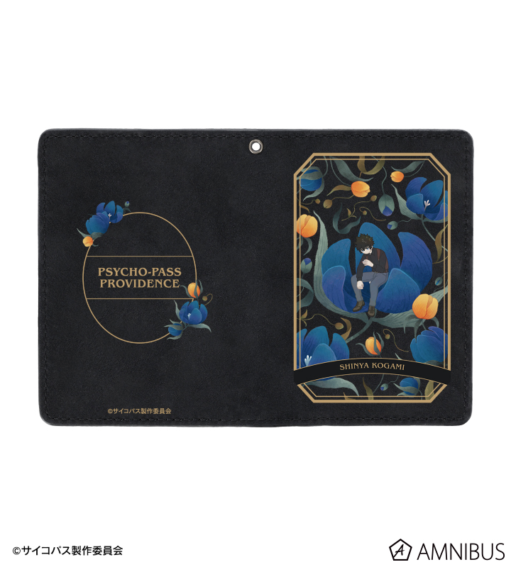 狡噛 慎也のイラスト、作品名、キャラクターの名前をボタニカルデザインに落とし込んで繊細なタッチで新たに描き起こし、ヌバック調4ポケットパスケースに仕上げました。