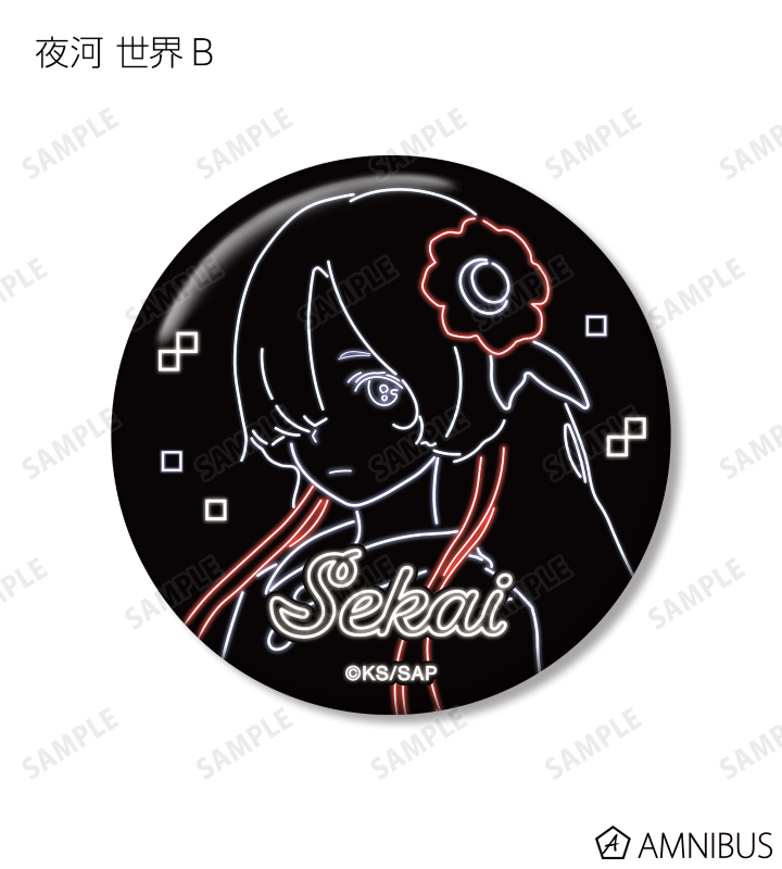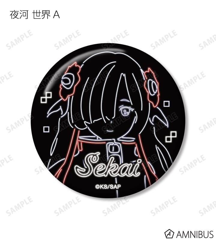 森先 化歩、谷置 狸眼、朝主 派流、夜河 世界、輪廻 此処のイラストをネオンカラーで表現した缶バッジに仕上げました。