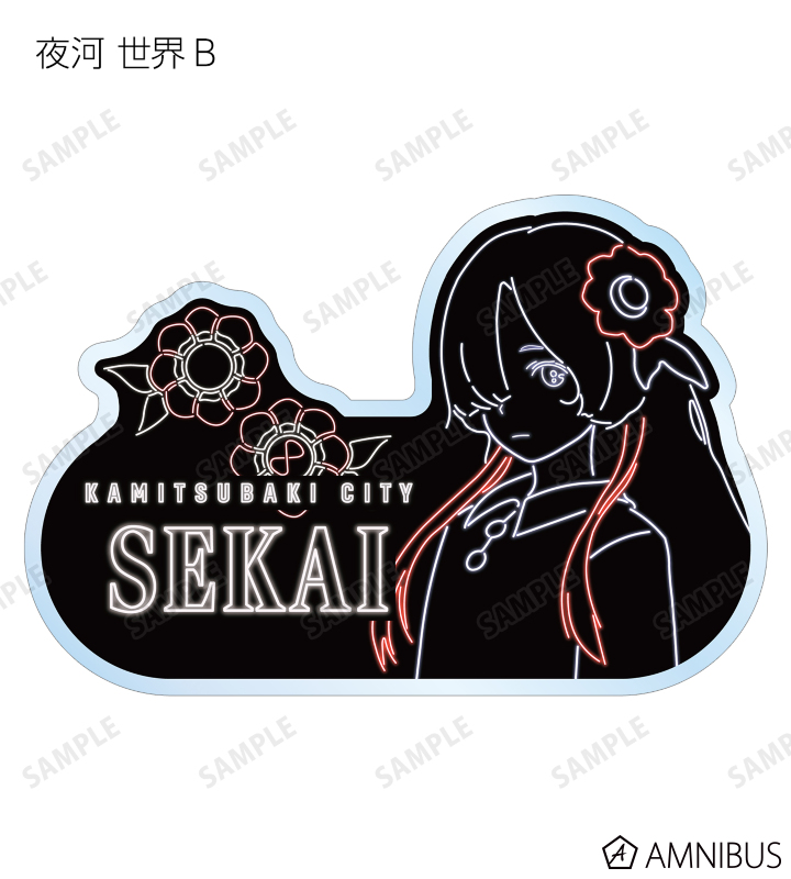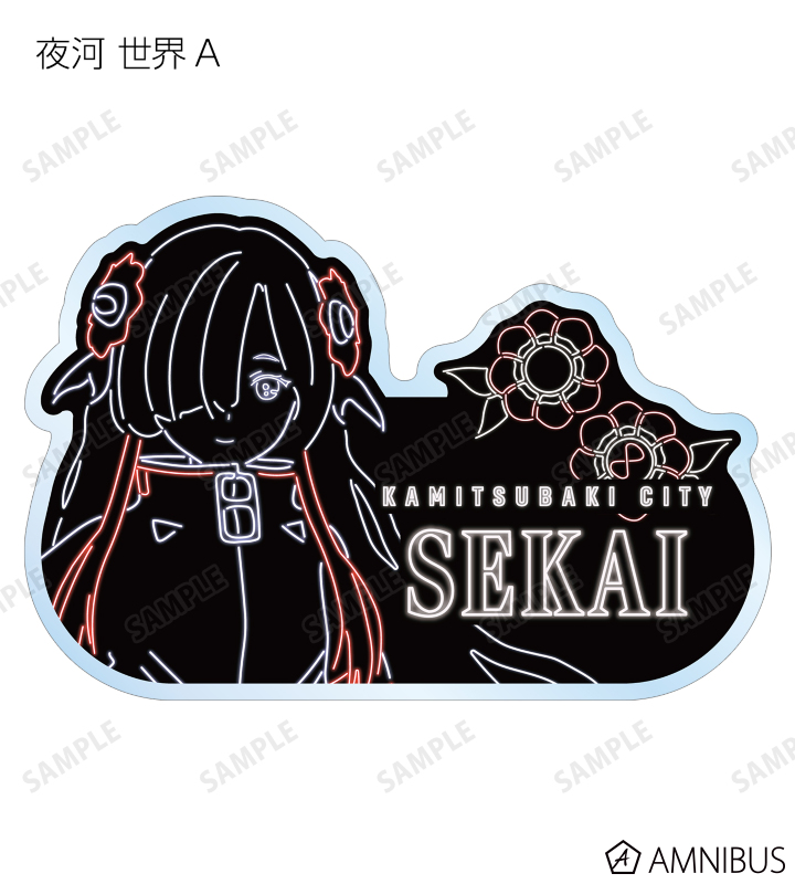 森先 化歩、谷置 狸眼、朝主 派流、夜河 世界、輪廻 此処のイラストとアイコンモチーフを、ネオンカラーで表現したアクリルネームプレートに仕上げました。