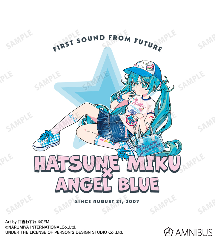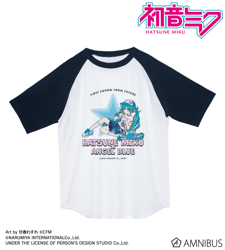 『初音ミク』×「ANGEL BLUE」のコラボレーションアイテム「ANGEL BLUEコラボ 描き下ろし 初音ミク Art by 甘春わすれ ラグランTシャツ ver.A」の登場です。