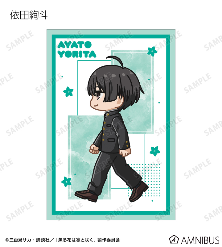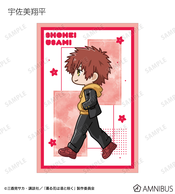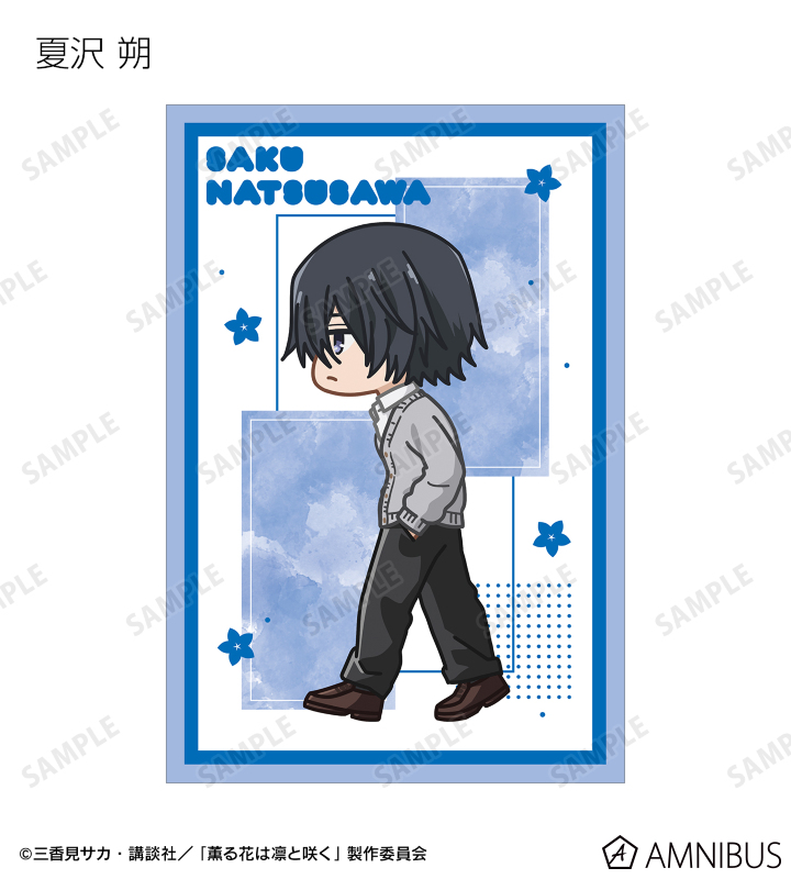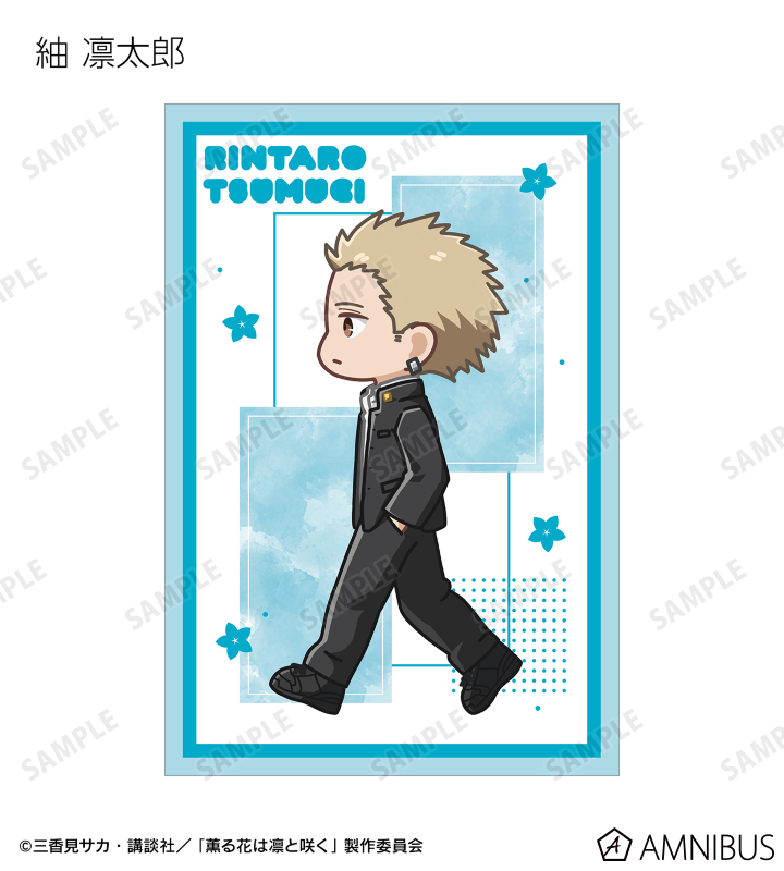 紬 凛太郎、和栗薫子、宇佐美翔平、夏沢 朔、依田絢斗、保科 昴が歩いているちびキャラを新たに描き起こし、花のモチーフをあしらったポストカード6枚セットに仕上げました。