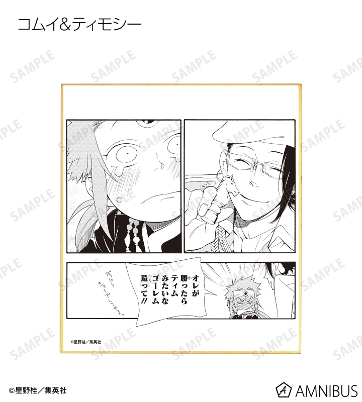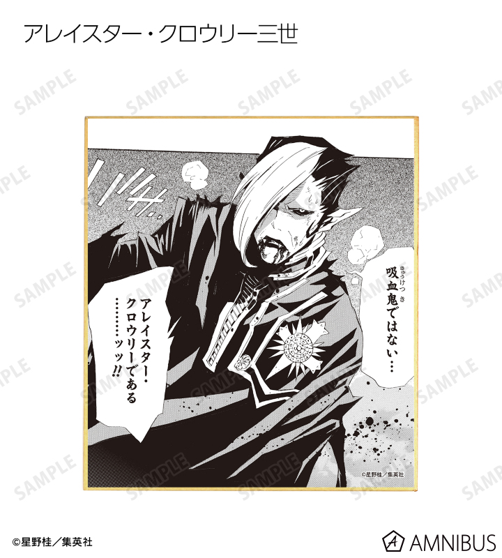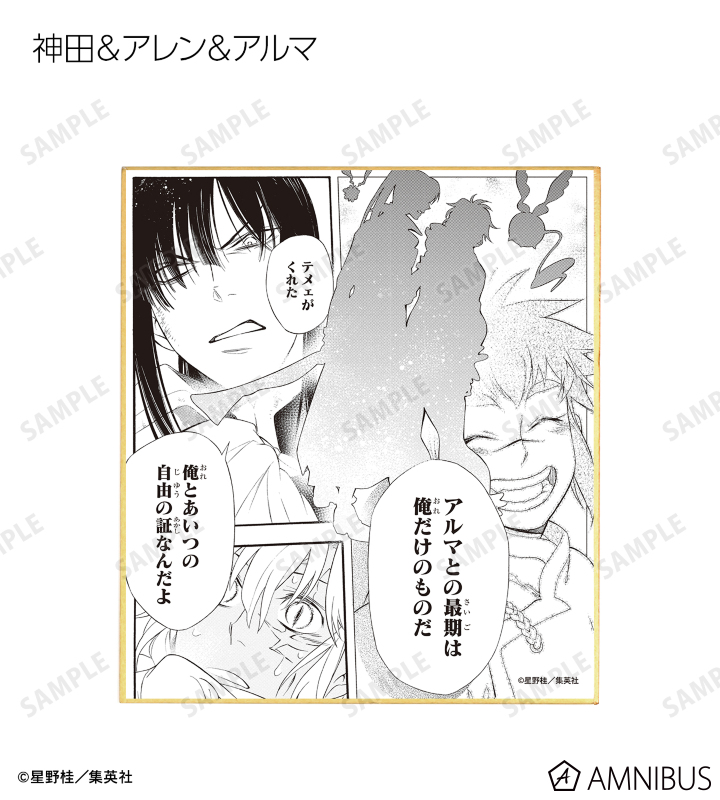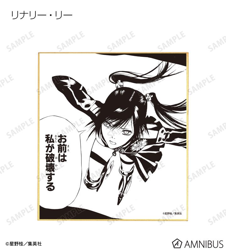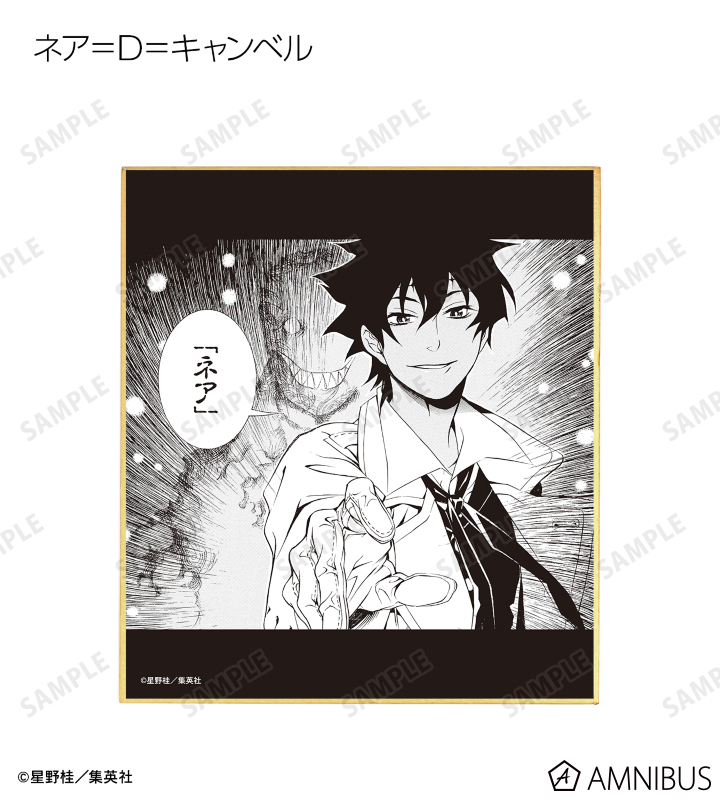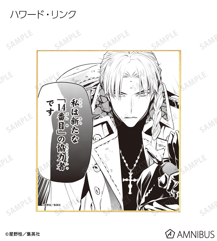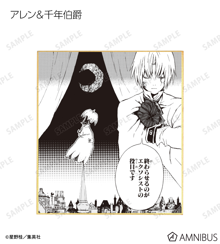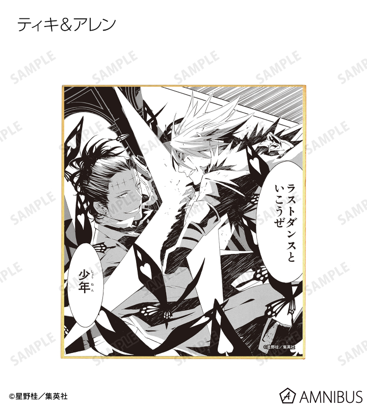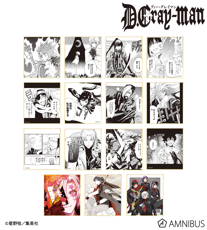 アレン・ウォーカー、千年伯爵、神田ユウ、アルマ、ラビ、リナリー・リー、アレイスター・クロウリー三世、クロス・マリアン、ティムキャンピー、コムイ・リー、ティモシー・ハースト、ハワード・リンク、ティキ・ミック、ネア=D=キャンベルの原作コマ、カラーイラストをミニ色紙に仕上げました。