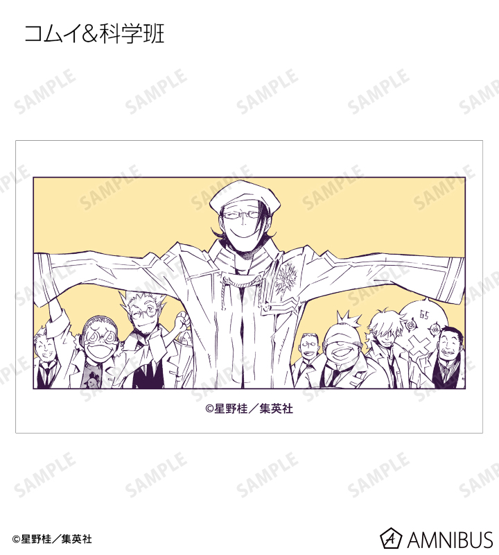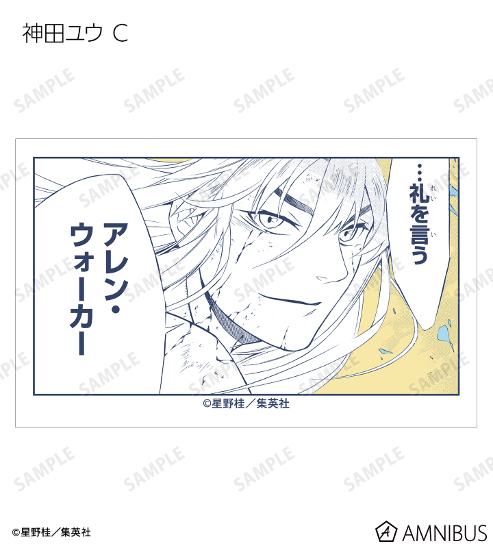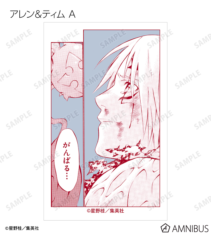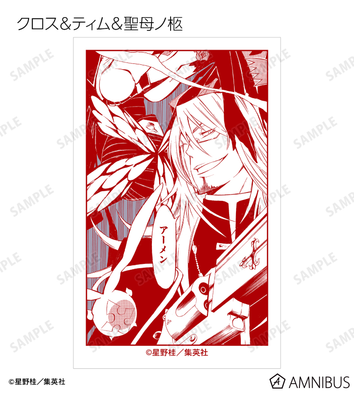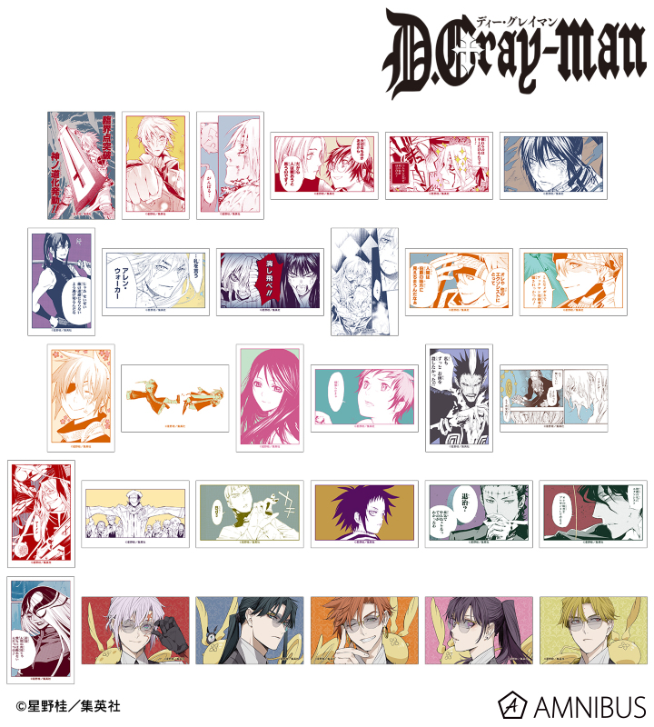 アレン・ウォーカー、ティムキャンピー、フォー(蝋花の姿)、コムリン、神田ユウ、アルマ、ラビ、ブックマン、リナリー・リー、アレイスター・クロウリー三世、ミランダ・ロットー、ノイズ・マリ、クロス・マリアン、聖母ノ柩、コムイ・リー、科学班、ハワード・リンク、ロード・キャメロット、ティキ・ミック、ジャスデビ、ゴーレムの原作コマ、カラーイラストをイラストカードに仕上げました。