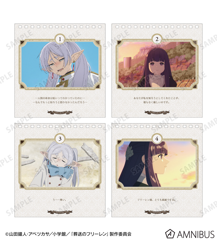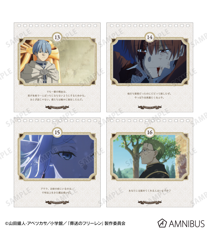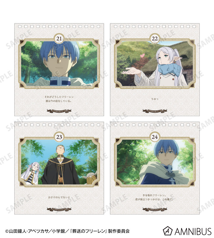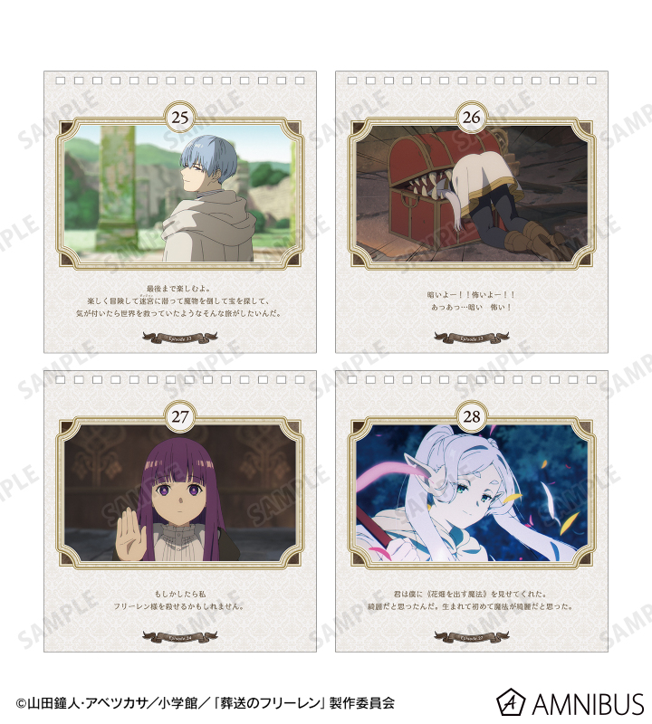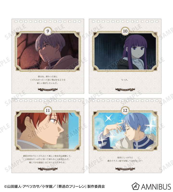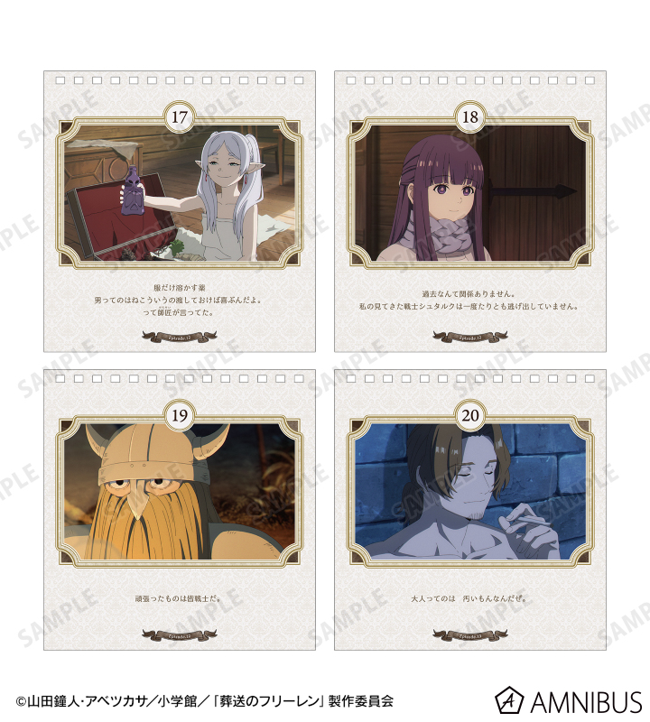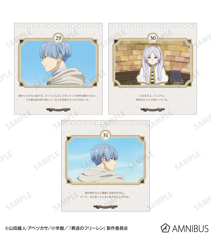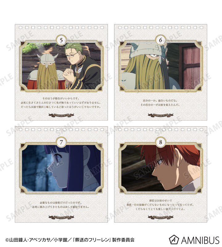 フリーレン、フェルン、シュタルク、ヒンメル、ハイター、アイゼン、ザインの印象的なシーンを日替わりでお楽しみいただける日めくりカレンダーに仕上げました。