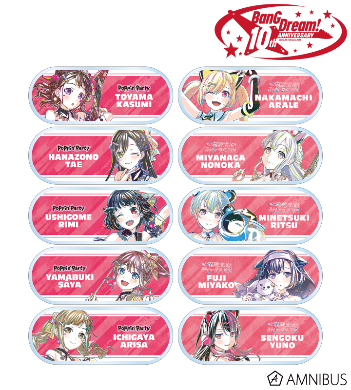 戸山 香澄、花園 たえ、牛込 りみ、山吹 沙綾、市ヶ谷 有咲、仲町 あられ、宮永 ののか、峰月 律、藤 都子、千石 ユノのイラストを新たなタッチで魅力的に表現し、アクリルネームプレートに仕上げました。