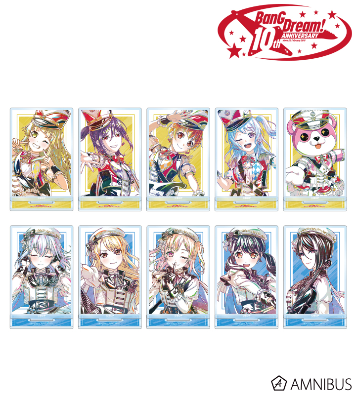 弦巻 こころ、瀬田 薫、北沢 はぐみ、松原 花音、ミッシェル、倉田 ましろ、桐ヶ谷 透子、広町 七深、二葉 つくし、八潮 瑠唯のイラストを新たなタッチで魅力的に表現し、バンドカラーと組み合わせてアクリルスタンドに仕上げました。