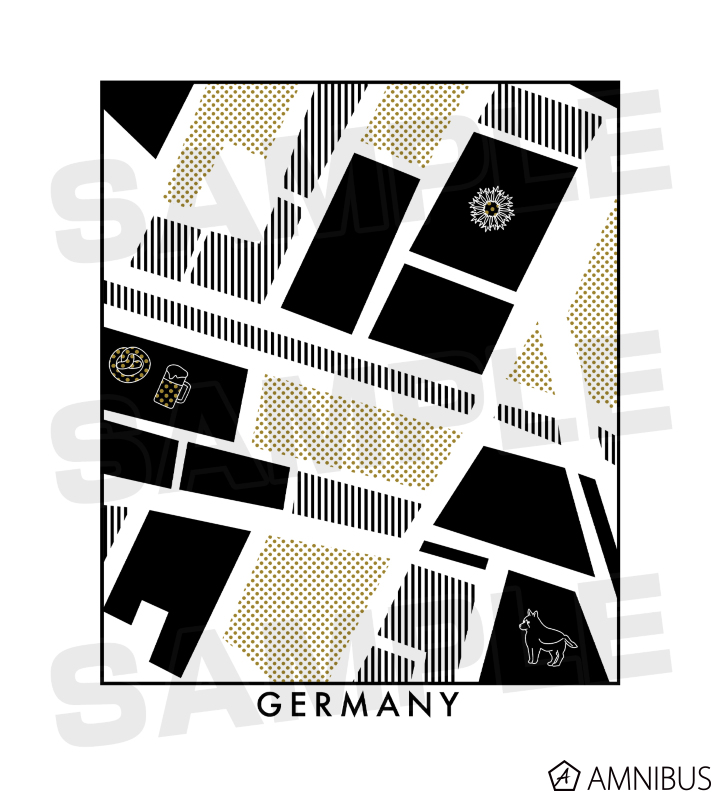 ドイツをイメージした地図にヤグルマギク、ビール、プレッツェル、ドイツが飼っている犬などのドイツに馴染みのあるモチーフを散りばめたデザインに仕上げました。