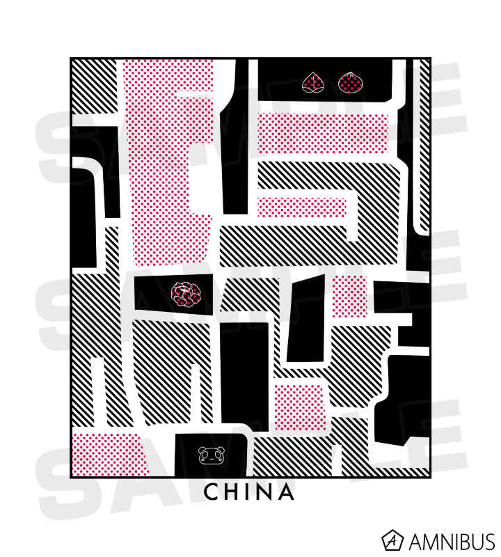 中国をイメージした地図に牡丹、桃まん、パンダ、飲茶などの中国に馴染みのあるモチーフを散りばめたデザインに仕上げました。