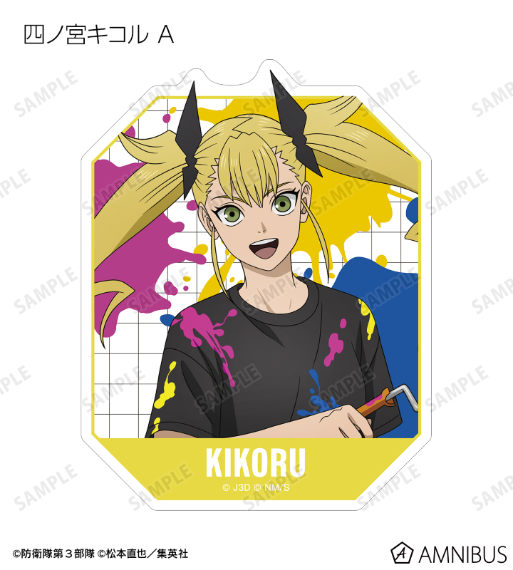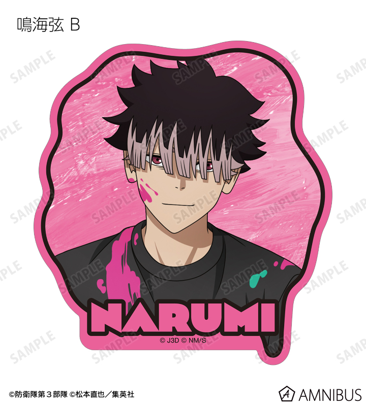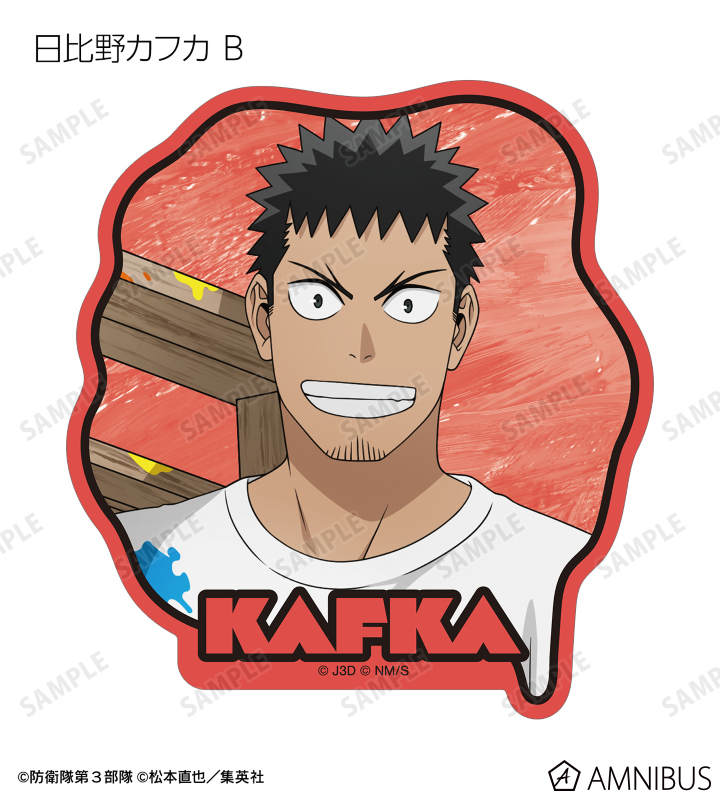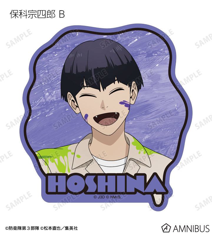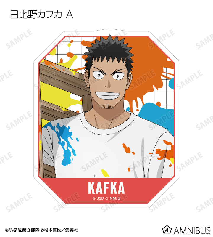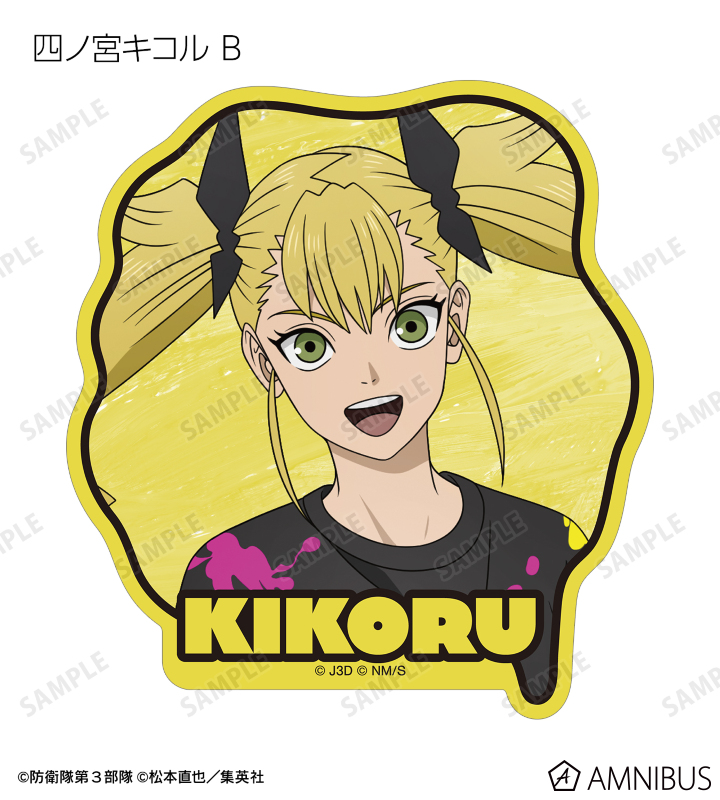 日比野カフカ、市川レノ、四ノ宮キコル、亜白ミナ、保科宗四郎、鳴海弦、古橋伊春の描き下ろしイラストをダイカットのステッカーに仕上げました。