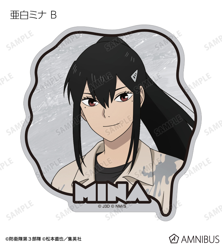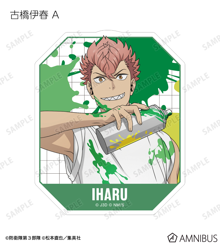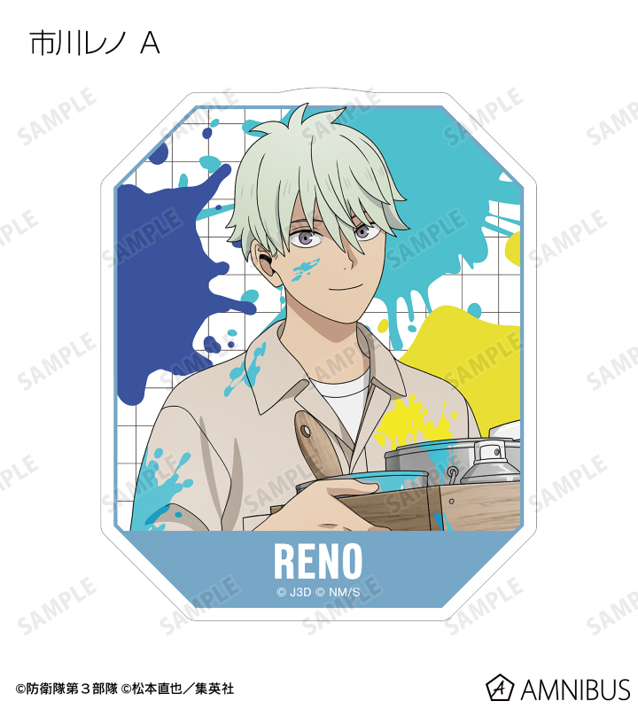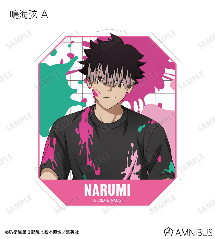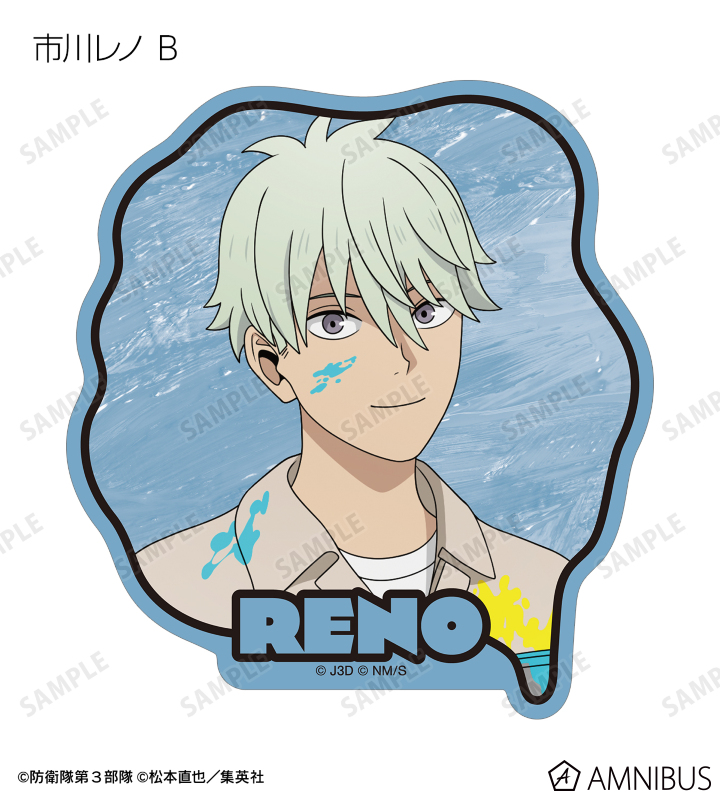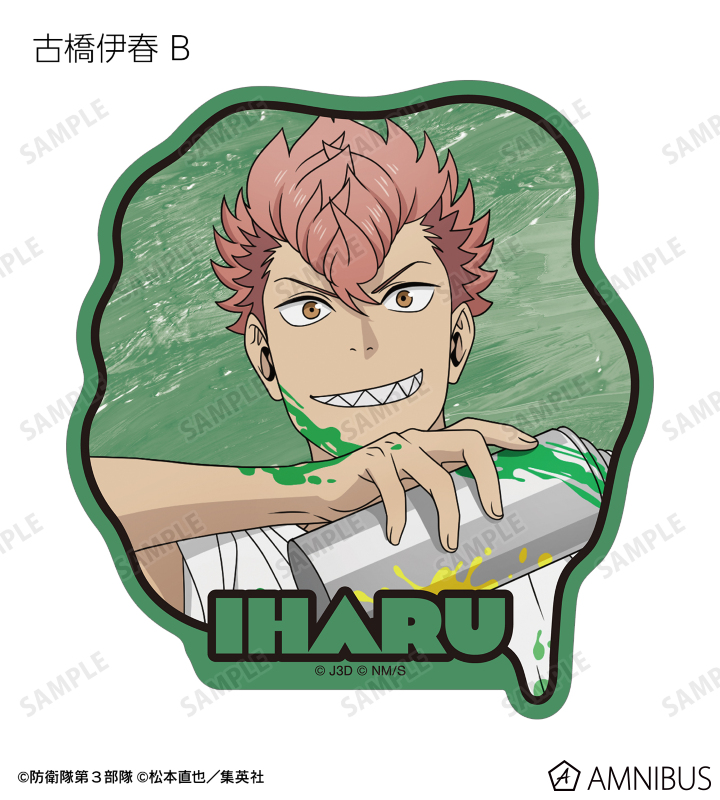日比野カフカ、市川レノ、四ノ宮キコル、亜白ミナ、保科宗四郎、鳴海弦、古橋伊春の描き下ろしイラストをダイカットのステッカーに仕上げました。