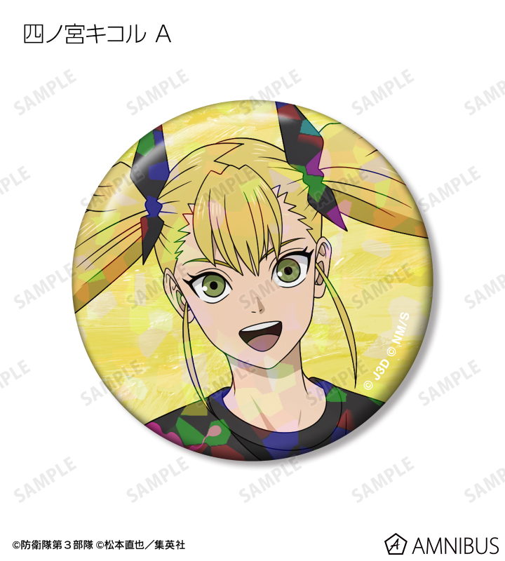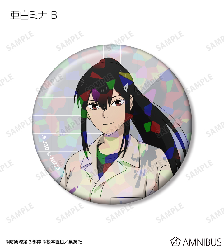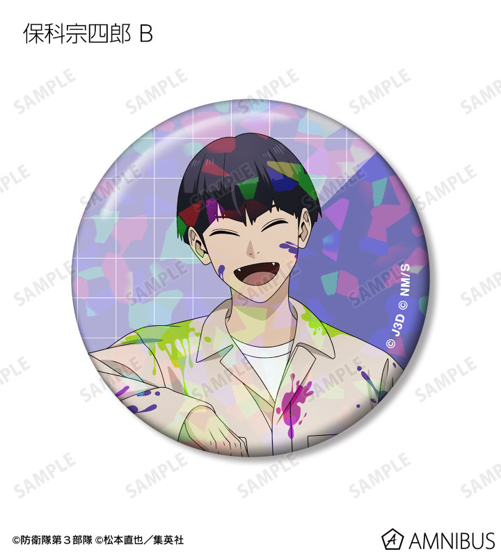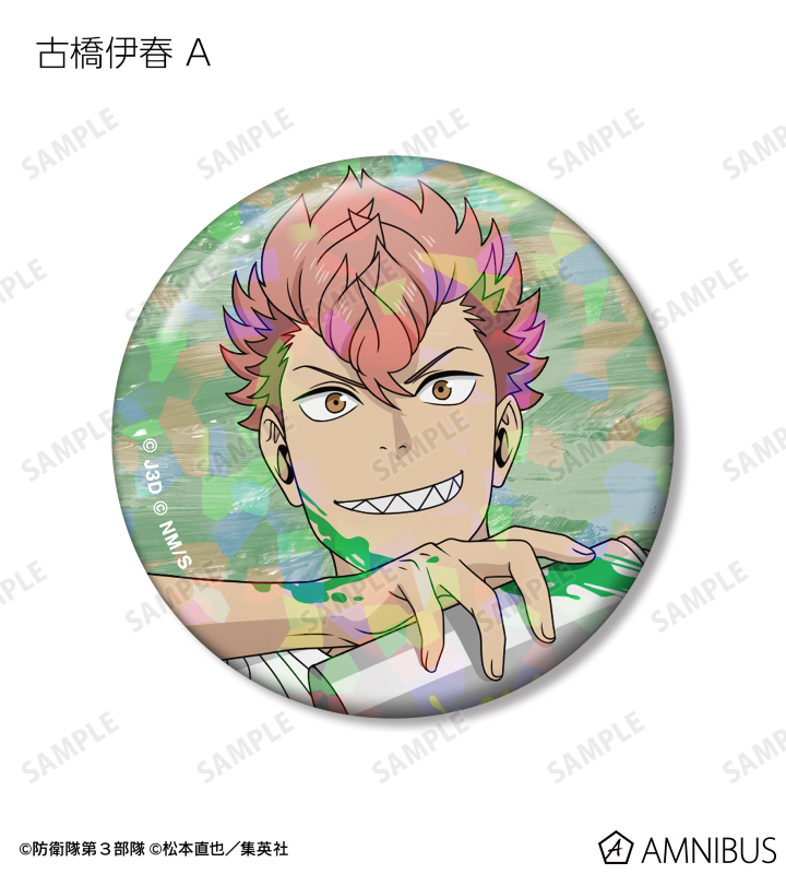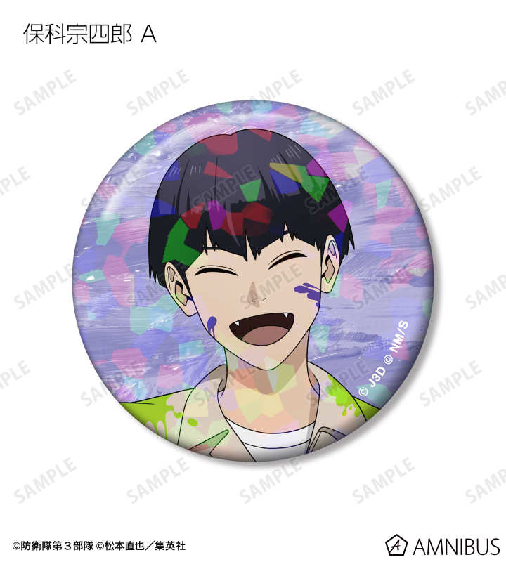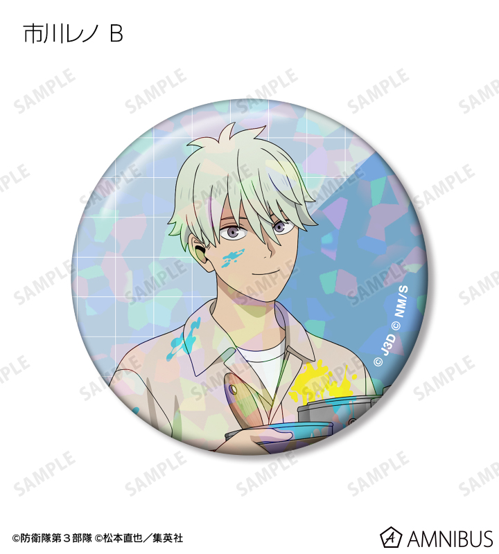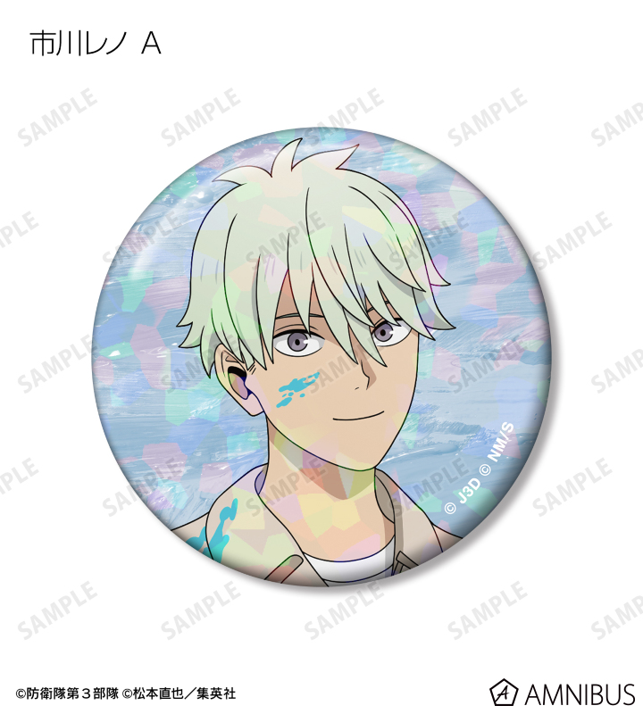 日比野カフカ、市川レノ、四ノ宮キコル、亜白ミナ、保科宗四郎、鳴海弦、古橋伊春の描き下ろしイラストをホログラム加工を施した缶バッジに仕上げました。