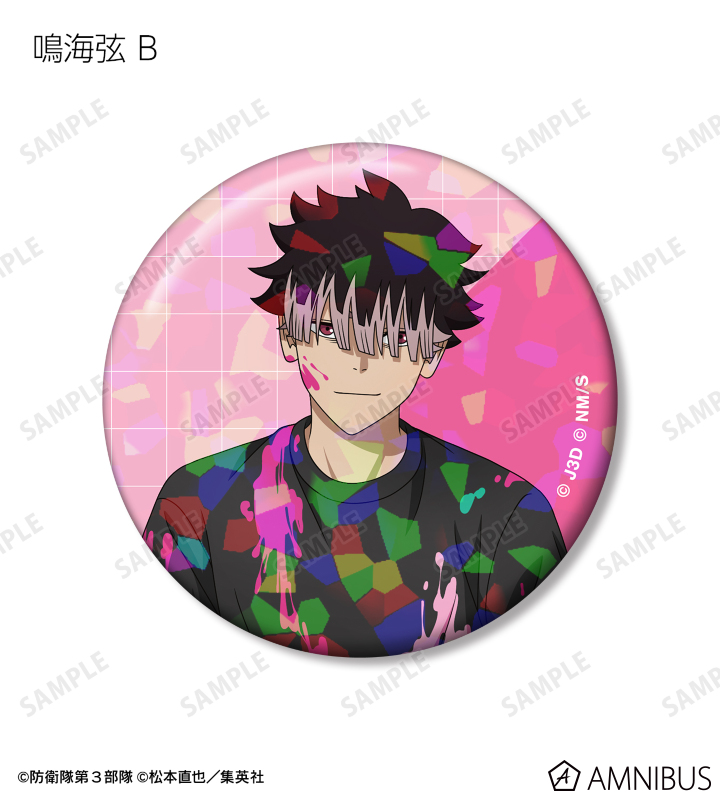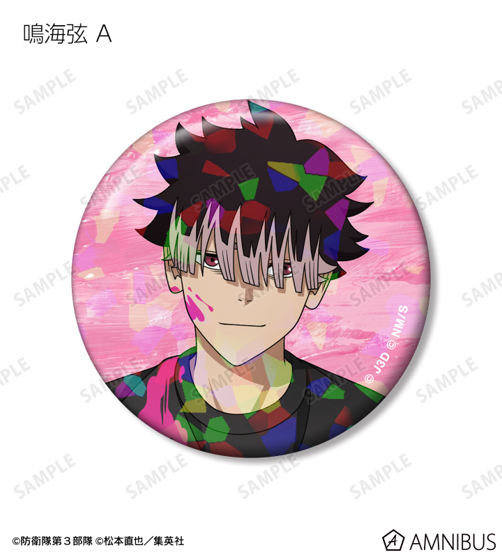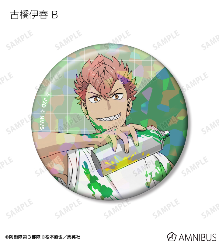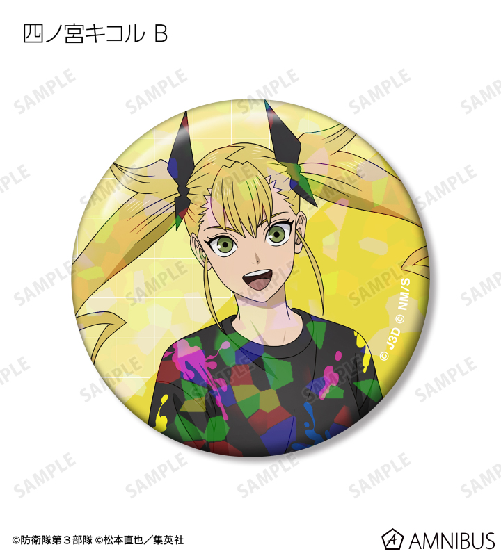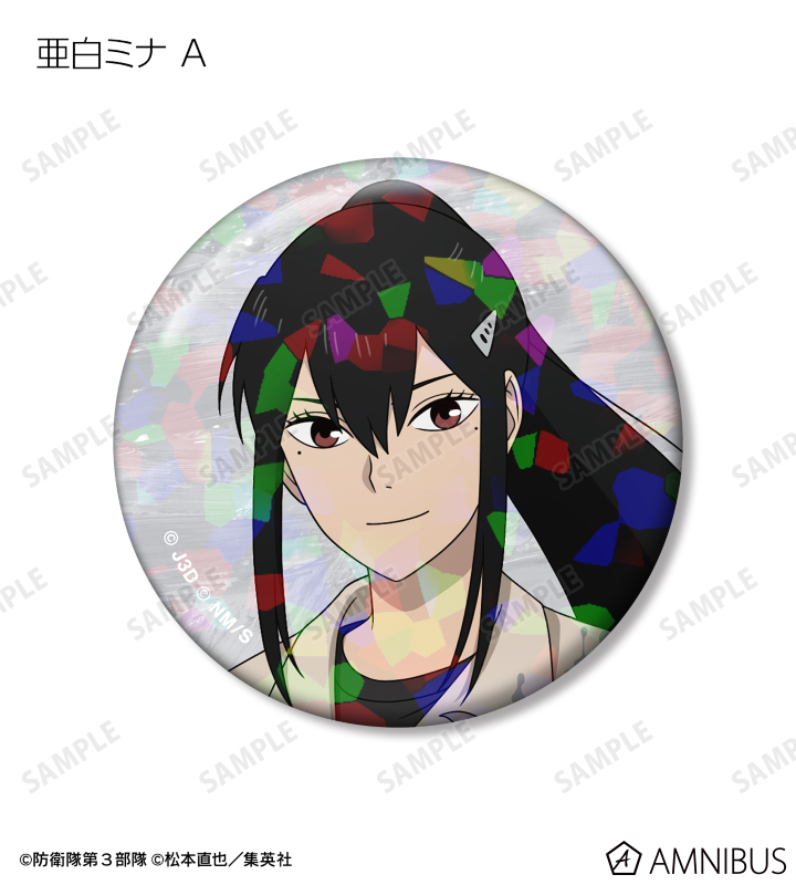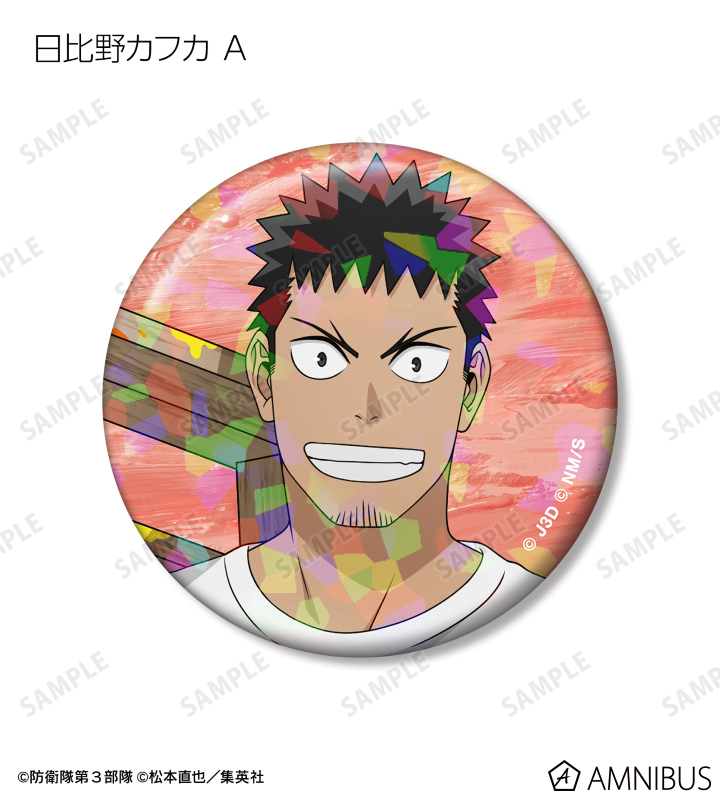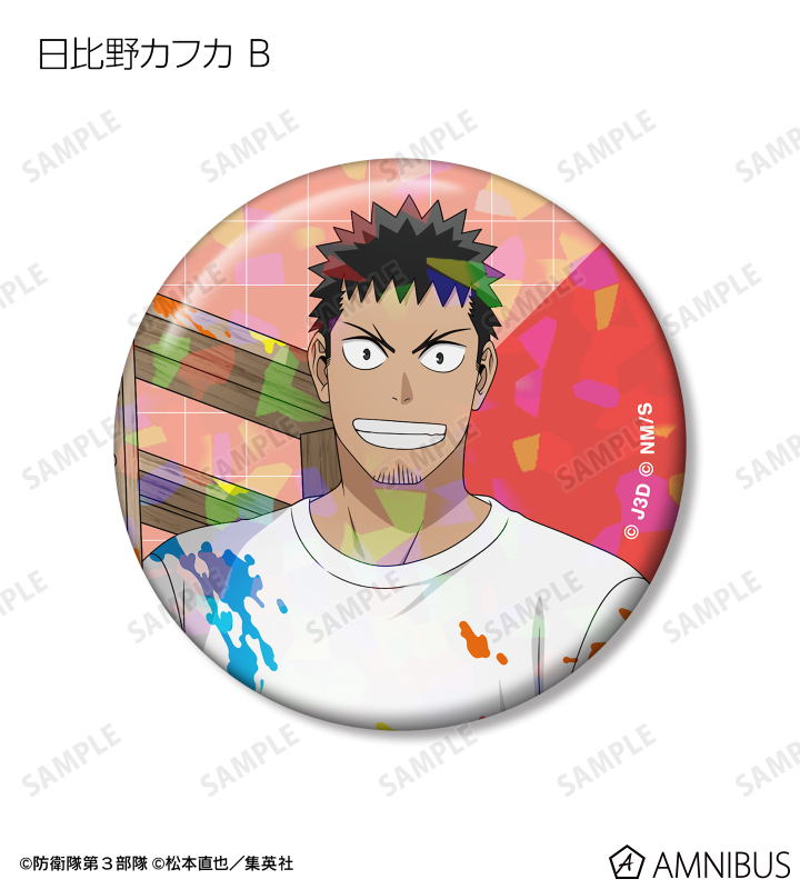 日比野カフカ、市川レノ、四ノ宮キコル、亜白ミナ、保科宗四郎、鳴海弦、古橋伊春の描き下ろしイラストをホログラム加工を施した缶バッジに仕上げました。