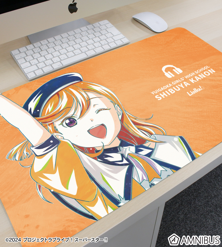 澁谷かのんのイラストを新たなタッチで魅力的に表現し、メンバーアイコン、学校名などを組み合わせたマルチデスクマットに仕上げました。