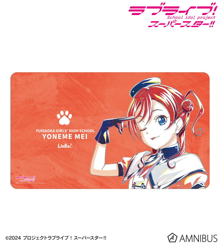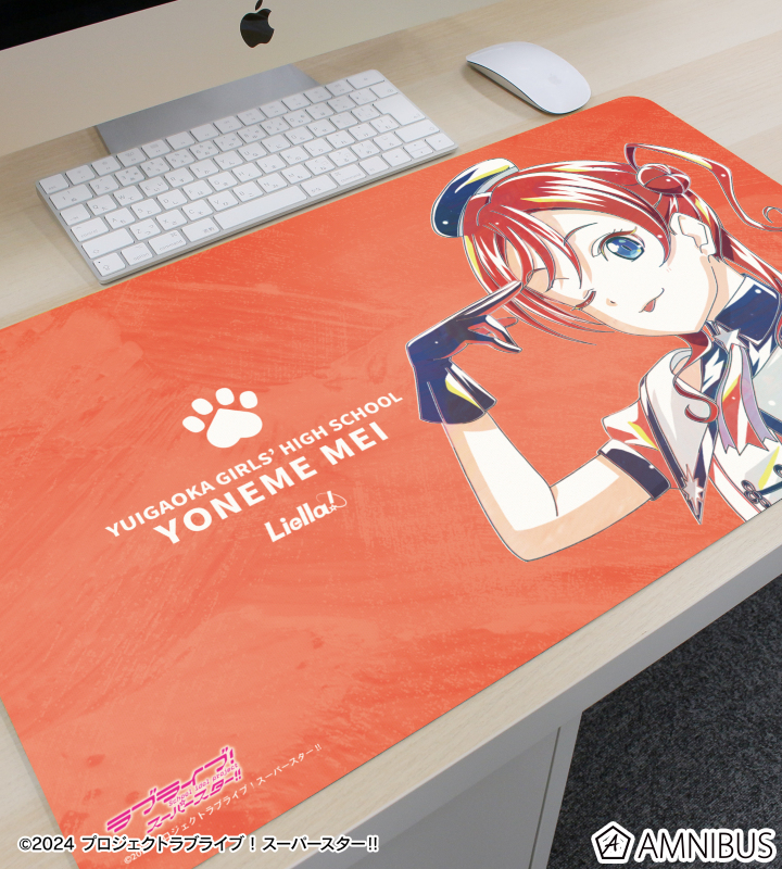 米女メイのイラストを新たなタッチで魅力的に表現し、メンバーアイコン、学校名などを組み合わせたマルチデスクマットに仕上げました。
